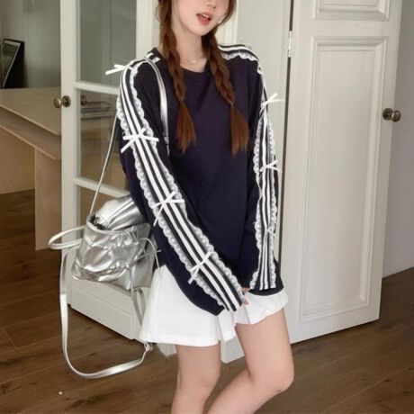 袖にあしらったレースラインと小さなリボンが、今季トレンドのフェミニンとスポーティミックスを表現。