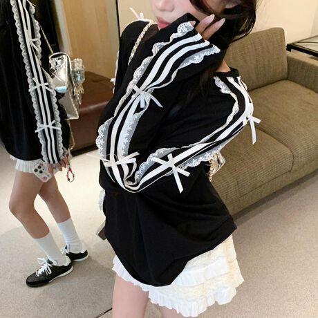 袖にあしらったレースラインと小さなリボンが、今季トレンドのフェミニンとスポーティミックスを表現。