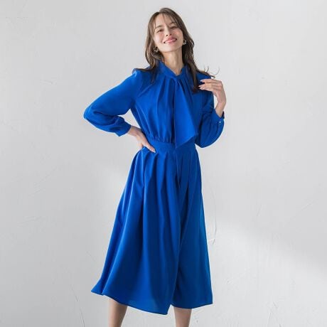 スラッシュ仕様のボウタイが付いたエレガントなワンピース。