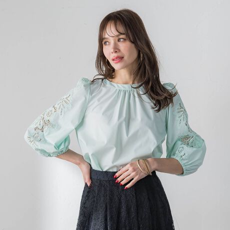 袖と胸元にオリジナルの繊細なレースをたたきつけた上品なブラウス。