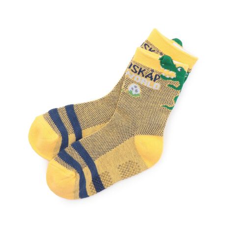 ティラノサウルスの親子を個性的に描いたクルーソックスです。鼻の頭が突起しているユーモラスなデザイン。つま先のライン使いがクールなアクセントになっています。メッシュ編みで通気性が良く、足裏にすべり止めプリントを備えているのも魅力です。