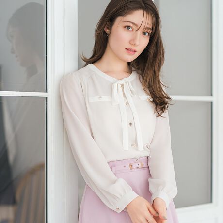 配色デザインが目を引くリボンディテールが、シンプルな中に華やかさをプラスする長袖ブラウス。