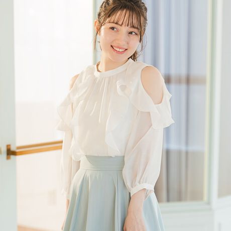 肩のさりげない肌見せがポイントのオープンショルダーが女性らしさを引き立てるブラウス。