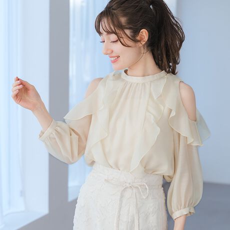 肩のさりげない肌見せがポイントのオープンショルダーが女性らしさを引き立てるブラウス。