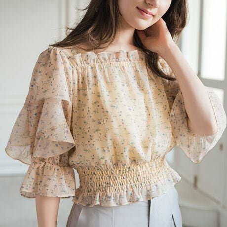 小花柄のシアー素材が、やさしくフェミニンな印象を演出するブラウス。