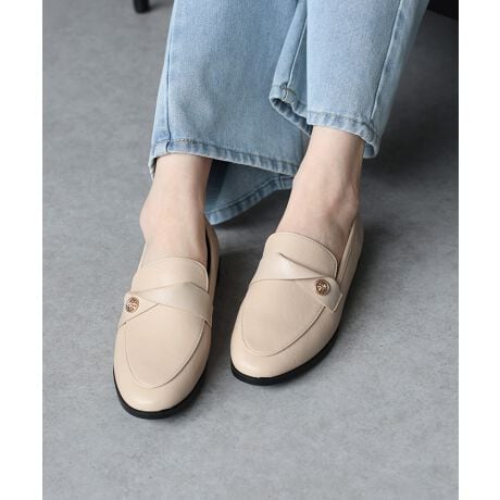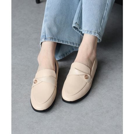 足元にクラス感を添える、ゴールドモチーフをあしらったキチンと見えローファー。