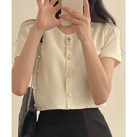 きちんと感も女性らしさも叶う、ツイード風ノーカラー半袖ジャケット。