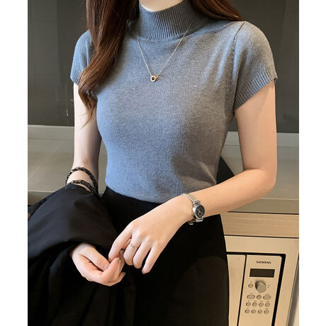 サラッとなめらかで高見えする半袖プチハイネックサマーニット。