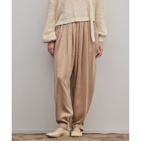 旬なシルエットで魅せる大人のバルーンパンツ。落ち感・起毛感のあるシルキーなフィブリル素材を使用し、モード感溢れるバルーンシルエットを表現した一本です。たっぷり贅沢に生地を使用していますがもたつかず、美しいドレープが映えるデザインに。裾のタブでアレンジを楽しめ、お好みによってシルエットの変化を楽しめます。主役級の存在感がありますが無地で着合わせやすく、お手持ちのシンプルなトップスを合わせるだけで雰囲気のあるトレンドスタイルを楽しめるのが魅力。ウエストはゴム仕様にし、リラックスした着心地を実現しました。大人のエフォートレスなニュアンススタイルを楽しめる、今季見逃せないパンツです。