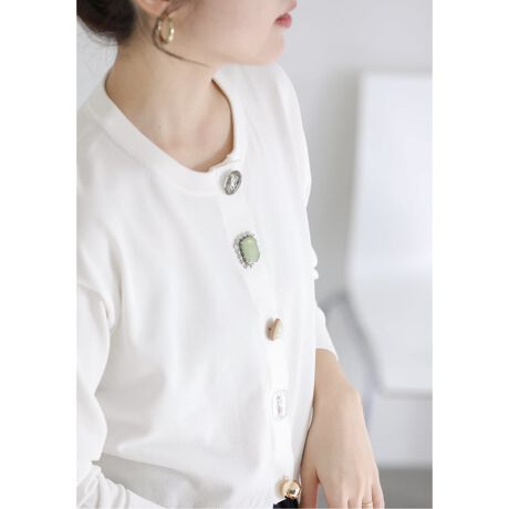 ビジューボタンがアクセントとなり、一枚で女性らしく華やかなスタイルが完成します。