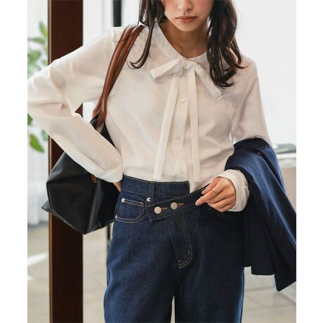ジレやベスト合わせなどインナー使いにも活躍し、タイはリボンにしても垂らしてもアレンジ変化を楽しめるボウタイブラウスです。