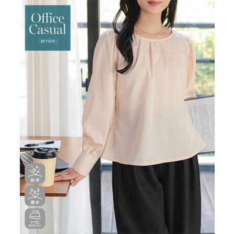 程よい袖ボリュームでジャケットの中にも通しやすく、撥水・防汚・皺になりにくい布帛生地なので通勤や会議の日も安心して着られます。
