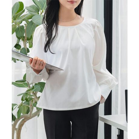 程よい袖ボリュームでジャケットの中にも通しやすく、撥水・防汚・皺になりにくい布帛生地なので通勤や会議の日も安心して着られます。
