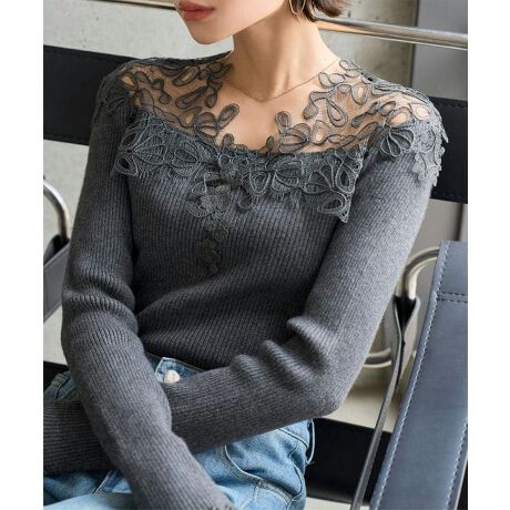 大HITレースニット【N1277】のような大ぶりの胸元レースが目を惹く高見えオフショルリブニット。