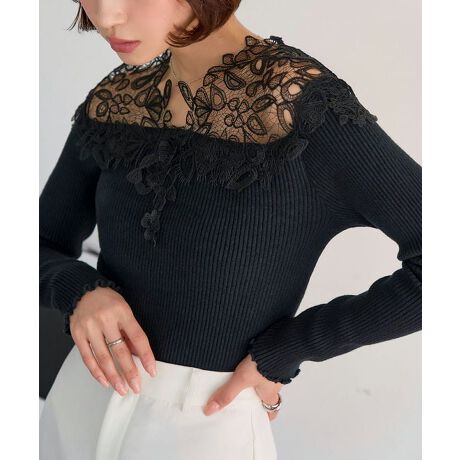 大HITレースニット【N1277】のような大ぶりの胸元レースが目を惹く高見えオフショルリブニット。