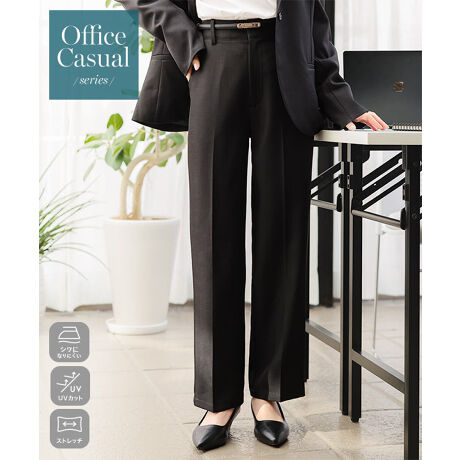 高ストレッチ・防しわ・UVカットを兼ね備え、長時間でもラクなのにきちんと感が続くオフィス向けストレートパンツ。
