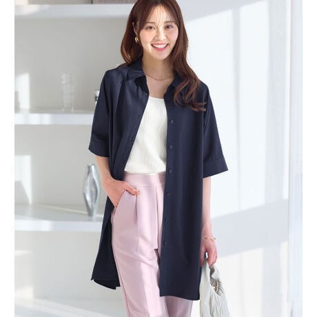 前開きデザインのシャツワンピースは、ボタンを閉じてチュニックワンピとしても羽織りとしても活躍。