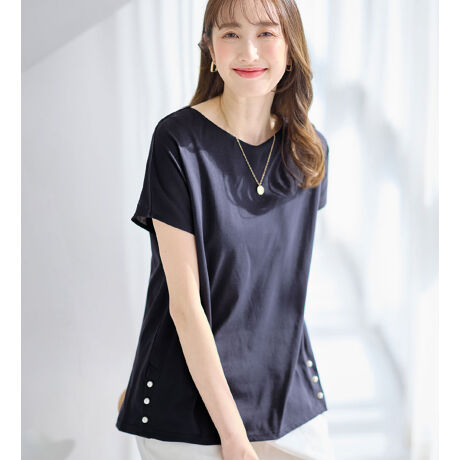 裾に並んだパール調ボタンが、シンプルなデザインに華を添える上品な1枚。