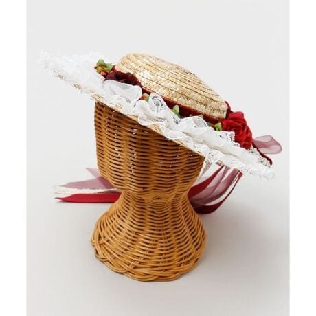 [型番:YCYP6113-2026]華やかなローズと繊細なレースで装飾されたクラシカルなハット。クリップ付きで着脱も簡単、しっかり固定できるのも嬉しいポイント。麦わら素材のナチュラル感とリボンのアクセントが、フラやイベント衣装に上品な可憐さを添えます。