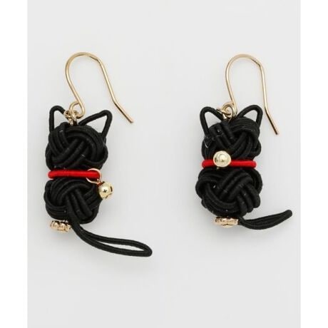 [型番:7PZZ6101-2026]日本の猫をモチーフにした、水引細工のピアス。白猫や黒猫、ブチネコなど愛らしい姿を繊細な結びで表現しました。金色の鈴がちょこんと揺れ、動くたびに優しい音色が響きます。