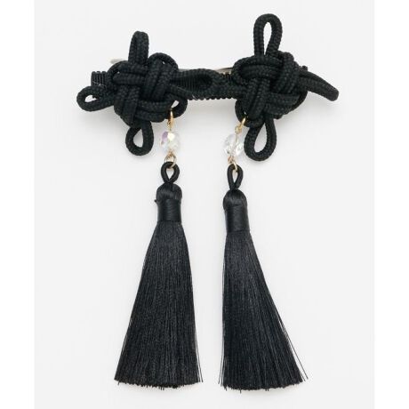 [型番:7PZZ6106-2026]華やかな組み紐をあしらった上品なバレッタ。立体的に結ばれた組み紐が存在感を放ち、揺れるタッセルが優美な動きを添えます。伝統的な結びの美しさとモダンな色合わせが調和したデザインです。
