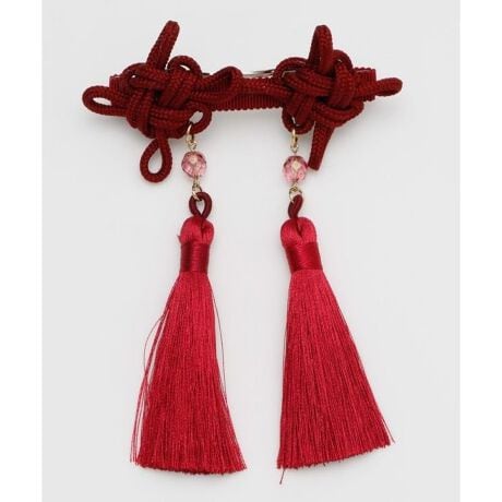[型番:7PZZ6106-2026]華やかな組み紐をあしらった上品なバレッタ。立体的に結ばれた組み紐が存在感を放ち、揺れるタッセルが優美な動きを添えます。伝統的な結びの美しさとモダンな色合わせが調和したデザインです。