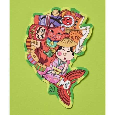[型番:7GSP6102-2026]【倭物やカヤ×鈴木ひょっとこ】伝統×現代の融合を魅力的に描く、画家・鈴木ひょっとことのコラボ商品。小さな縁起物が力を合わせた姿を大きな鯛に見立て、大漁旗をイメージしたデザイン。耐久性に優れた特殊素材を使用しており、キャリーバッグなどにも安心して貼れるステッカーです。