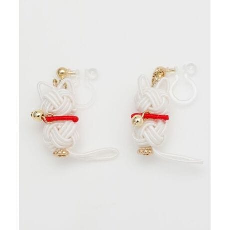 [型番:7PZZ6102-2026]日本の猫をモチーフにした、水引細工のイヤリング。白猫や黒猫、ブチネコなど愛らしい姿を繊細な結びで表現しました。金色の鈴がちょこんと揺れ、動くたびに優しい音色が響きます。