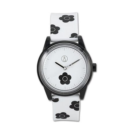 ・マルチ:黒の文字盤に総柄のアウトラインデイジーがシックなデザイン。針やバンド部分の穴はカラフルで、遊び心もプラス
