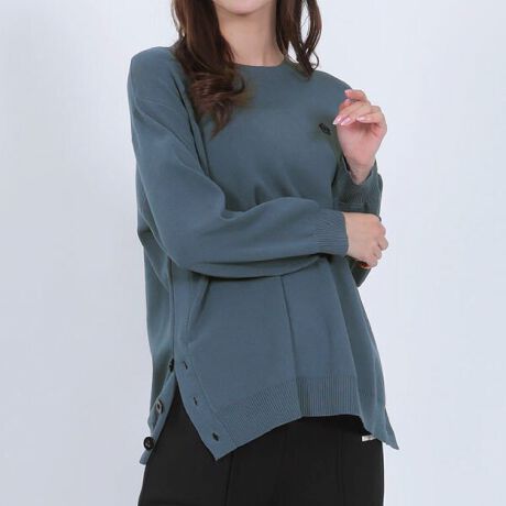 涼しげな素材のニット・プルオーバー。◆ポイント・ドライタッチできれいめな素材・左胸にデイジー刺繍・両脇のボタンを開けるとスリットにもなるデザイン・長袖◆コーディネート快適な着心地で、お出かけにおすすめの一枚です。裾のボタンを開けて、スリットからインナーを見せるレイヤードコーデも。[型番:226-701901]