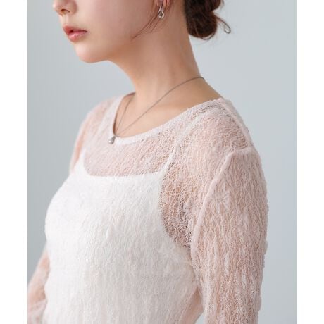 伸縮性のあるやわらかな着心地。薄手のレース素材で軽く、レイヤードしてもごわつきにくいのがポイントです。ロングシーズン取り入れやすい素材感です。