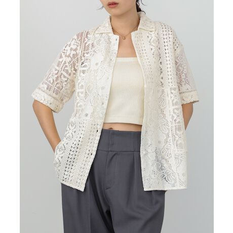 繊細なパッチワークレースが目を惹く、涼しげな半袖シャツ。異なる3種類のレースを組み合わせることで、奥行きのある表情とさりげない華やかさを演出してくれます。ほどよくゆとりのあるシルエットで、抜け感のある大人フェミニンなスタイリングが叶う一枚です。