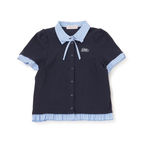 別布のドッキングでレイヤード風にデザインしたTシャツです。色合いと風合い、柄の組み合わせにこだわった2色展開。首元のリボンはお好みでつけ外せるため、その日の気分や羽織りものに合わせてアレンジするのがおすすめです。裾フリルのさりげないかわいい演出も見逃せません。
