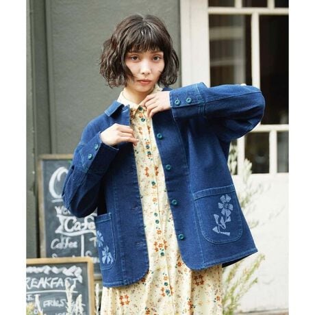 カジュアルコーデには欠かせないジャケット。カバーオール風で着丈が長く、ゆったりとしたワークテイストなシルエットです。ドロップショルダーでリラクシーな着用感が魅力。大きめのパッチポケットデザインのポイントで、上からお花のプリントを施しました。微配色のステッチや前開きのボタンにも注目。