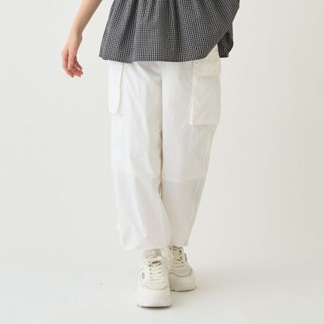 軽やかな素材で仕上げた撥水機能つきのカーゴパンツです。