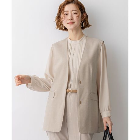 麻のようなナチュラルな風合いが魅力のノーカラージレです。フロントの開閉はホック仕様になっており、留めても開けても上品な印象を保ちます。ちらりと覗くゴールドパーツが、さりげないアクセントとなり、着こなしに華を添えます。 同素材のパンツと合わせれば、洗練されたセットアップスタイルが完成し、オフィスシーンにも最適です。また、Tシャツやブラウスにデニムやワイドパンツを合わせたカジュアルなスタイルに羽織るだけで、ぐっとこなれた印象に。幅広いコーディネートに活躍する、着回し力抜群の一着です。 カラーは、上品で洗練された印象のライトグレー(#003)、やわらかくどんなスタイルにも馴染む万能カラーのベージュ(#033)、知的で落ち着いた印象でビジネスシーンにも最適なネイビー(#075)の3色展開です。