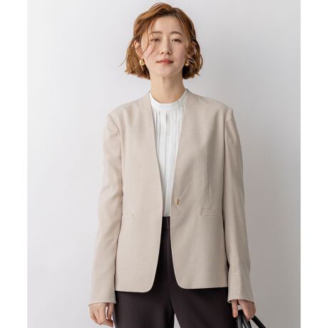 麻のようなナチュラルな風合いが魅力の素材で仕立てた、上品なノーカラージャケットです。ウエストの絞りを微調整できるため、その日の気分やコーディネートに合わせてシルエットを変化させ、今っぽい着こなしをお楽しみいただけます。同シリーズのパンツと合わせれば、洗練されたセットアップスタイルが完成し、オフィスシーンにも最適です。また、Tシャツやデニムなどカジュアルなアイテムと合わせれば、普段使いにも活躍する着回し力の高さも魅力です。素材が軽やかなので、前を開けてさらりと羽織ったり、肩にかけたりと、こなれたスタイリングもおすすめです。 カラーは、清潔感があり顔周りを明るく見せるホワイト(#001)、上品で洗練された印象のライトグレー(#003)、やわらかくどんなスタイルにも馴染む万能カラーのベージュ(#033)、知的で落ち着いた印象でビジネスシーンにも最適なネイビー(#075)の3色展開です。