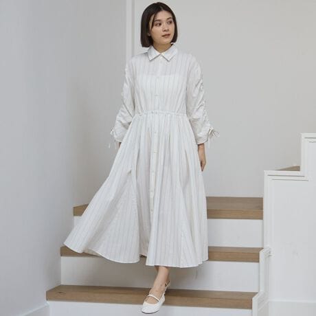 ギャザーによるクシュっと感が可愛らしいシャツワンピースです。