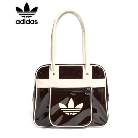 パテント素材を使用し、スタイリッシュで光沢のある作りに。アイコニックなトレフォイルのブランディングが存在感を添える。長めのハンドルで肩掛けしやすく、街で過ごす時間やカジュアルな集まりにも適している。