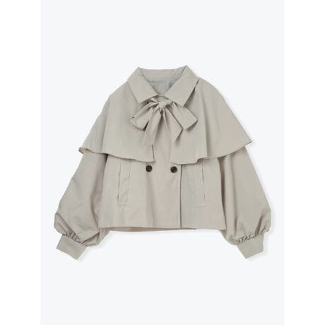[型番:26550735508]ケープデザインが目を引く、クラシカルな雰囲気のショートトレンチ。リボン付きの衿元とダブルボタン仕様で、甘さときちんと感をバランスよく両立しています。立体感のあるシルエットで、ボリューム袖やケープ部分がスタイリングに奥行きをプラス。軽めのアウターとして季節の変わり目に取り入れやすく、着こなしの主役になる一着です。
