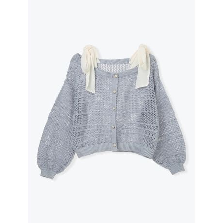 [型番:25550722711]繊細なラメ感が上品に映えるニットトップス。肩にあしらったリボンデザインが、コーディネートのさりげないアクセントに。程よく透け感のある編地とコンパクトな丈感で、軽やかなバランスに仕上げました。スカートと合わせて華やかに、デニム合わせで甘さを抑えた大人カジュアルな着こなしもおすすめです。モデル(ピンク着用)身長:162cmMサイズ着用