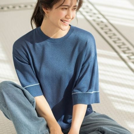 袖とボタンの配色がポイント!Tシャツ感覚のニットトップス