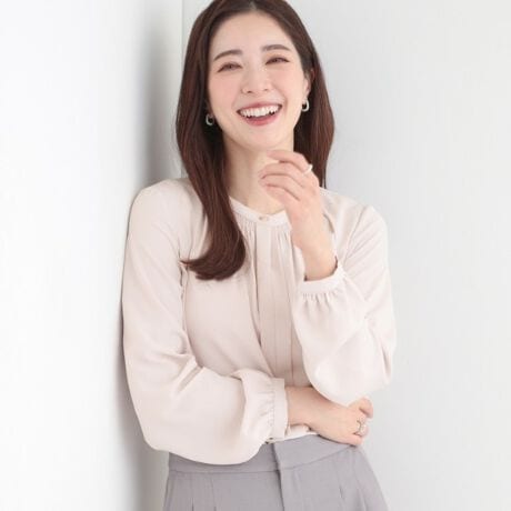 衿ぐりのきらっと光るメタルボタンがアクセントのブラウス。