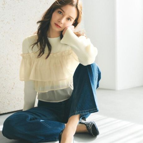 ・リブニットにシアーフリルの布帛ドッキングデザインで、キャッチーかつユニークなスタイルが楽しめます。