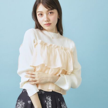 ・リブニットにシアーフリルの布帛ドッキングデザインで、キャッチーかつユニークなスタイルが楽しめます。