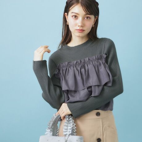 ・リブニットにシアーフリルの布帛ドッキングデザインで、キャッチーかつユニークなスタイルが楽しめます。