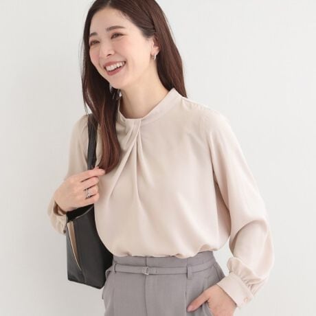 自分で結ぶ必要のないタイパが叶うニュアンスタイデザインブラウス。