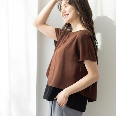 レイヤードデザインのバイカラーブラウス。