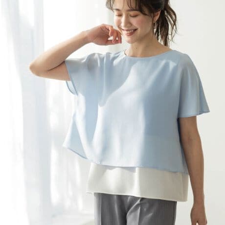 レイヤードデザインのバイカラーブラウス。