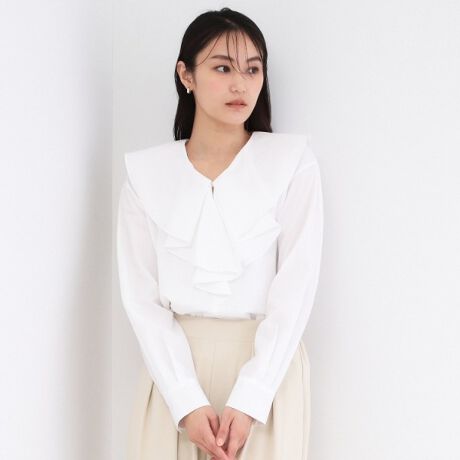 ・一枚ではもちろん、カーディガンやジャケットに合わせて、フリル衿を出した着こなしも。華やかでおすすめです。